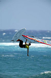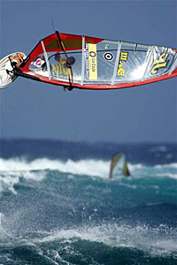 PWA Lanzarote Freestyle and Super X Grand Slam. День последний. Сегодняшний день начался с полного безветрия, но, как обещали местные, ветер будет дуть и волны еще поднимутся. Так и случилось. К 11:30 ветер усилился, волны достигли высоты четыре метра и ломались в начале рифа. На самом деле действие проходило совершенно также как и вчера. Гонщики вооружили свои паруса размером 3.5 и 4.0 и вышли. Robby Swift как всегда не вышел в полуфинал. В четвертьфинале произошла битва, как и вчера, между Konan Long и Diony Guadagnino, Tonky Frans и Kauli Seadi, Julien Taboulet и Colin Sifferlen, Anthony Ruenes и лидером чемпионата Ricardo Campello. В первом четвертьфинале встретились Guadagnino и Long. Первый делал чистые Spock, Grubby и высокие Table Top, и в итоге выиграл у бразильца Long. Kauli Seadi, который до этого момента был одним из самых стабильных виндсерферов, сейчас прыгал не очень, несколько раз падал, в результате открыв двери в полуфинал такому райдеру, как Tonky Frans. Tonky Frans вышел за счет своих красивых, чисто выполненных двойных Spock, которых ему хватило для выхода в следующий раунд.