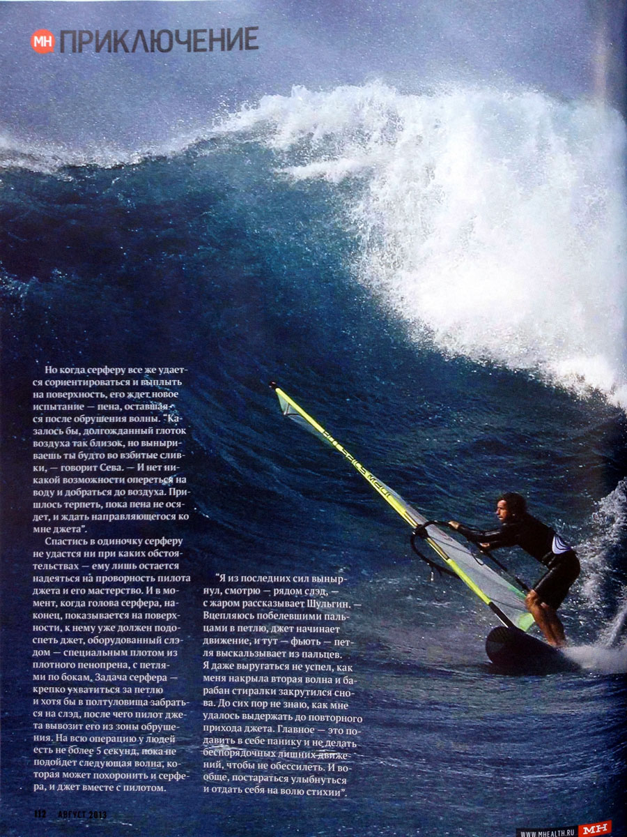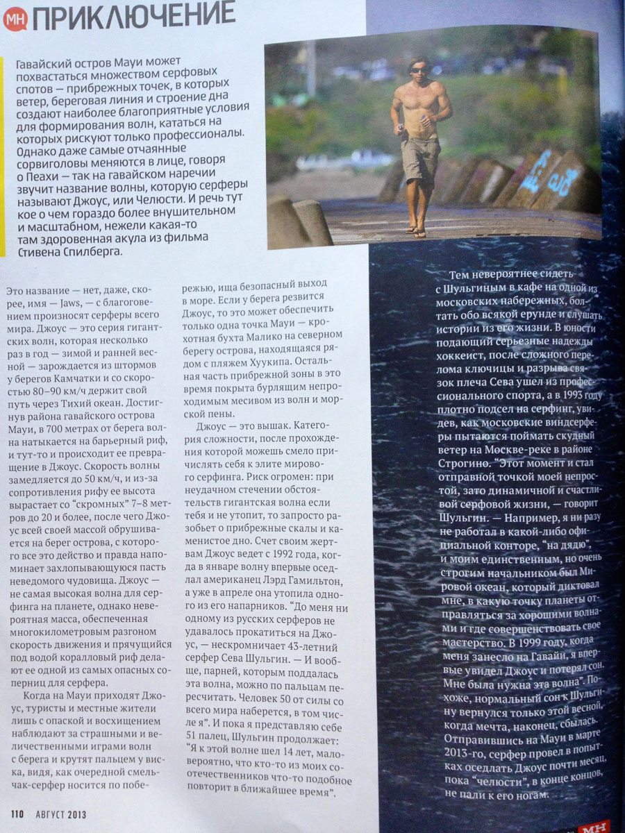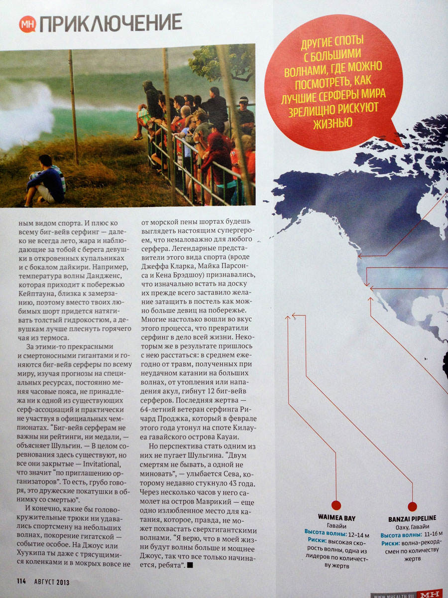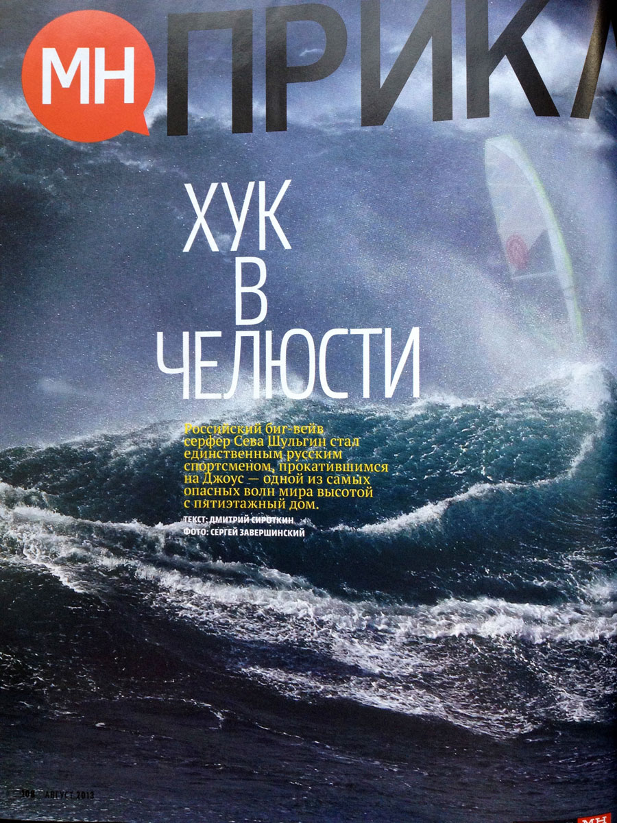 В августовском номере Men's Health опубликован большой материал посвященный волне Jaws, самой большой волне на планете. Мне выдалась удивительная возможность прокатиться на этой волне!