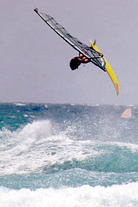 Волна небольшая, хотя отдельные тянут метра на полтора. Конечно после виденного на Гавайях, меня уже ничего не удивляет, наверное лишь цунами, тем не менее катание здесь кажется неплохим, ветер cross shore, небольшие но достаточно трамплинные волны, рушившиеся на рифах – серфинг без особого напряга... Вооружаю свою "четверку" и занимаю очередь к выходу на воду. Через некоторое время удается коснутся воды. Открытым остается вопрос с волной: где поднимается трамплинчик, образуются "пробки". Столько желающих прыгнуть, пусть даже с метровой, я не встречал нигде, даже на Хукипе. Покатавшись пару часов и совершив считанное количество прыжков, уверяю себя, что неплохо, но, если честно, бежать отсюда поскорей, ведь права на внеочередной прыжок в Каньосе я еще не заслужил. Лучше - в Португалию. Сева Шульгин. Август 2000 года Фото Сева Шульгин |