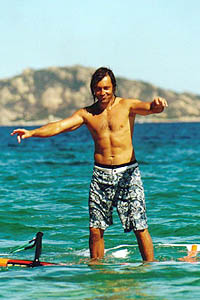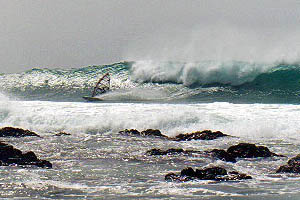 И как же себя вести в таком убийственном прибое?Надо зайти с доской в воду как можно глубже. Но не настолько, чтобы волна могла захлестнуть. Держать доску следует как можно выше над головой. Стоишь и ждешь, ждешь очень долго. Подходит последняя волна в сете, которая, обрушиваясь, едва не захлестывает тебя. И вот с обратным течением этой волны ты и должен отойти от берега. Это довольно безветренное место. И уж если порыв ветра тебя зацепил и ты отошел метров на 10-15, считай что вышел. Главное - не падать. Дальше ветра больше, но и волны уже не два-три метра, как в прибое, а пять-шесть, то и выше. Те волны, которыми и славятся Острова Зеленого Мыса. На каком острове лучше всего кататься? На острове Сал, в местечке Пунто Прета. Справка: Остров Сал самый непривлекательный из остров архипелага. Эрозия значительно сгладила рельеф острова, где осталось несколько вершин (Монти Гранди, 406м) и никакой растительности. Название Сал происходит от португальского слова "соль". Добыча соли долгое время была источником существования острова. Экспорт соли прекратился много лет назад и рудник удовлетворяет только нужды островов Кабо-Верде. Рыбная ловля, туризм и международный аэропорт в столице острова – Эспаргосе - сделались теперь основой экономической деятельности. Есть ли отличия в технике катания на европейских волнах и волнах Пунто Прета? На Пунто Прета очень быстрая волна - поймать ее нужно с разгона. Если не будешь разгоняться, она просто пройдет под тобой и ты не сможешь на ней прокатиться. Разогнавшись, садишься на волну и можешь считать: она твоя. Далее ты должен идти и готовиться к райдингу. Главное, чтобы эпицентр волны был всегда с "наветра", от тебя. Если волна обрушивается с "подветра", считай зря потратил силы. Если сидишь на волне, нельзя пропустить момент, когда она начинает рушиться, - надо сразу же скатываться вниз: делать поворот на ее дне(bottom turn) и взлетать обратно на ее же стенку, срезая верхушку волны(cut lip).
