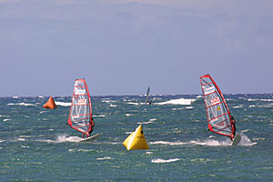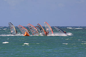 На собрание участников соревнований организаторами было принято решение проводить гонки, хотя стабильного ветра еще не было, но за рифом, в открытом океане можно было наблюдать полосу приближающегося ветра. Оставалось лишь надеяться, что ветер все же подойдет. И ветер пришел, и пришел столь яростно и неистово, что подготовленные нами «четверки», оказались непомерно велики. Но времени перевооружиться уже не осталось, судьи объявили старт.